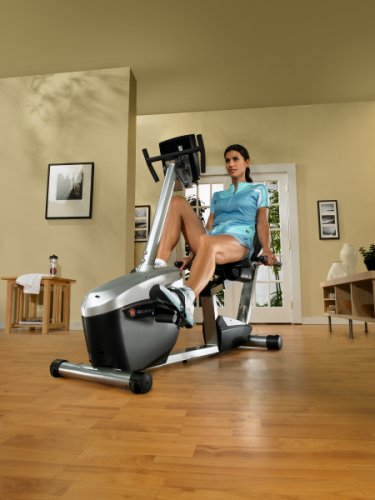 Compact stationary recumbent exercise bike with 6 preset programs and 16 resistance levels